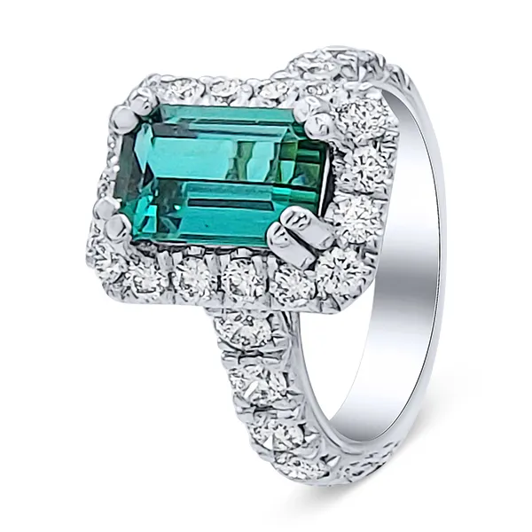 White 14 Karat Halo Fashion Ring With a 3.01Ct Emerald Cut Green Blue Tourmaline and 1.66Tw Round Brilliant G/H Si2 Diamonds Size 6.5